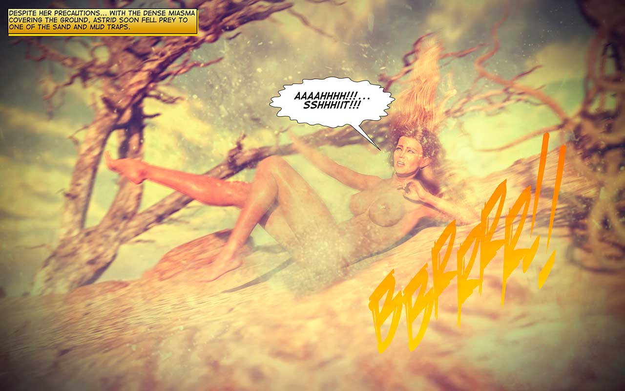 Despite her precautions... with the dense miasma covering the ground, astrid soon fell prey to one of the sand and mud traps to discover that sand traps and shifting terrain... were the least of her problems... Because the real danger rested beneath the sands!CLICK HERE to read ASTRARELLA - Defeated at Last #7: