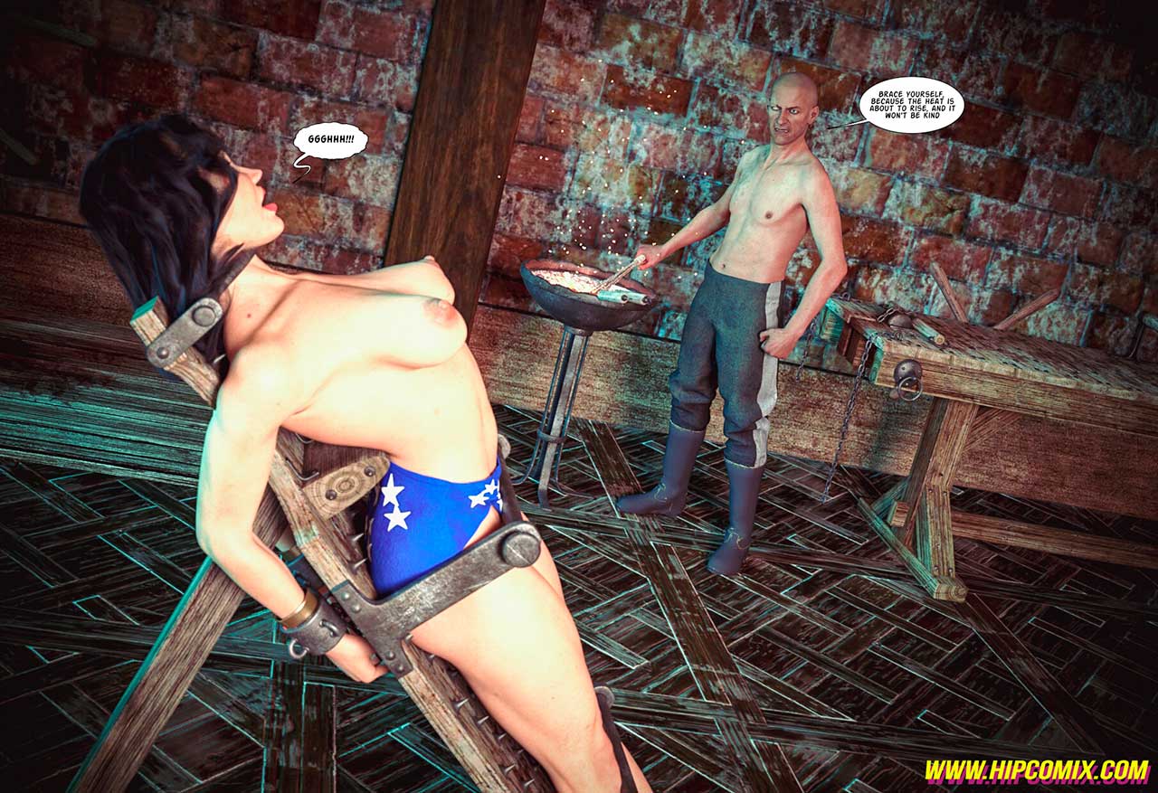 Castle Schatt's Dungeon... A place of unspeakable horrors. A new torture device was used to trap Wonder Woman at some point later, Muller adjusted the rack, a massive wooden device with chains and gears. Wonder Woman, wearing only her bottoms, is secured to the device with her hot body taut and exposed... Quickly, the evil Colonel's subordinate manipulated the device's controls to tighten the entire apparatus.