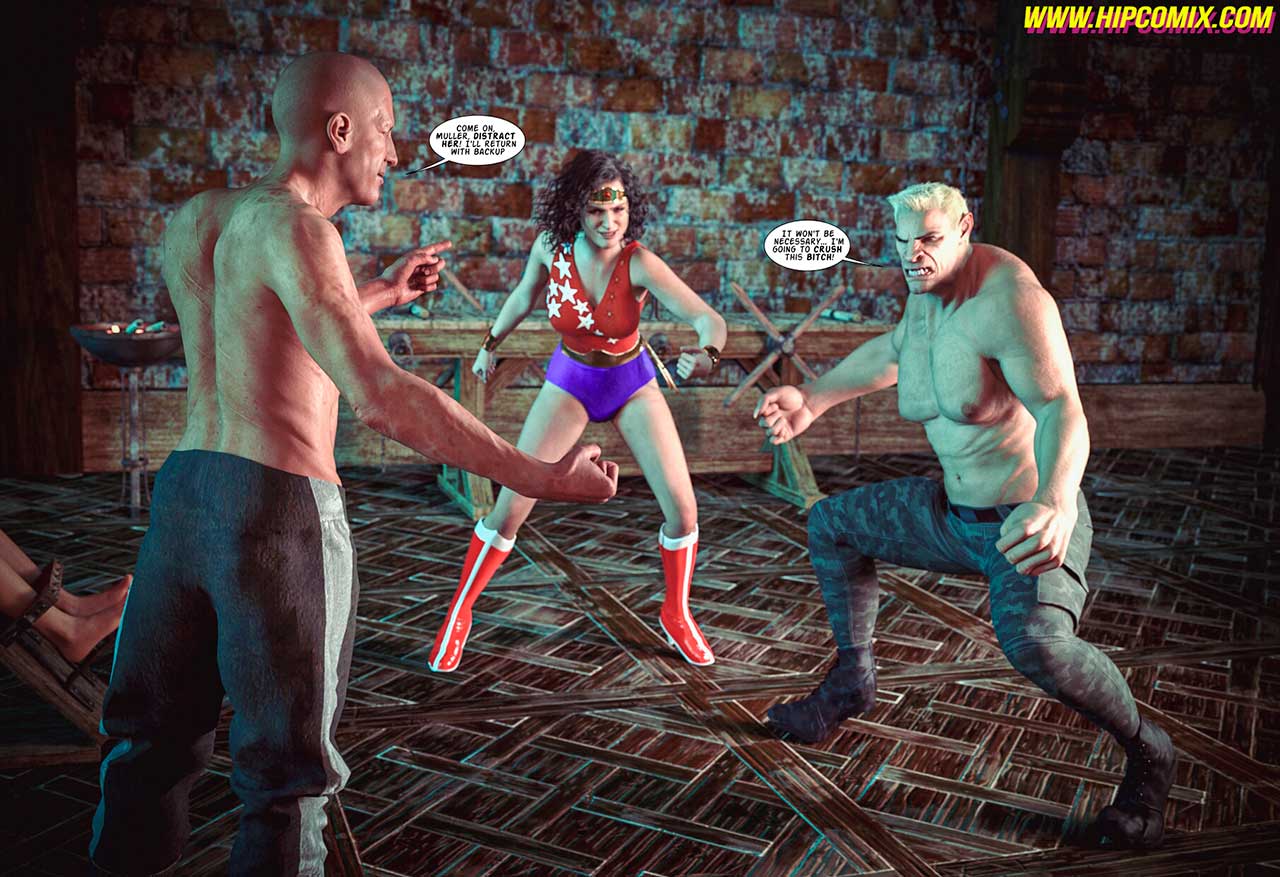 Castle Schatt's Dungeon... A place of unspeakable horrors. The villainous Colonel Schatt subjected Wonder Woman to cruel and inhumane treatment using an abhorrent torture device inspired by the brutal methods of the ancient Inquisition, all in his relentless pursuit of information regarding the whereabouts of the legendary and mythical Paradise Island. Following his unsuccessful attempt, he is now preparing to employ a different method in order to obtain the valuable information from the courageous Amazon princess who remains his captive... However, as a result of the drug she has been administered, Diana is on the verge of disclosing the secret location of Paradise Island. Just as she is about to reveal this critical information, Donna Troy suddenly makes an entrance, interrupting the moment!