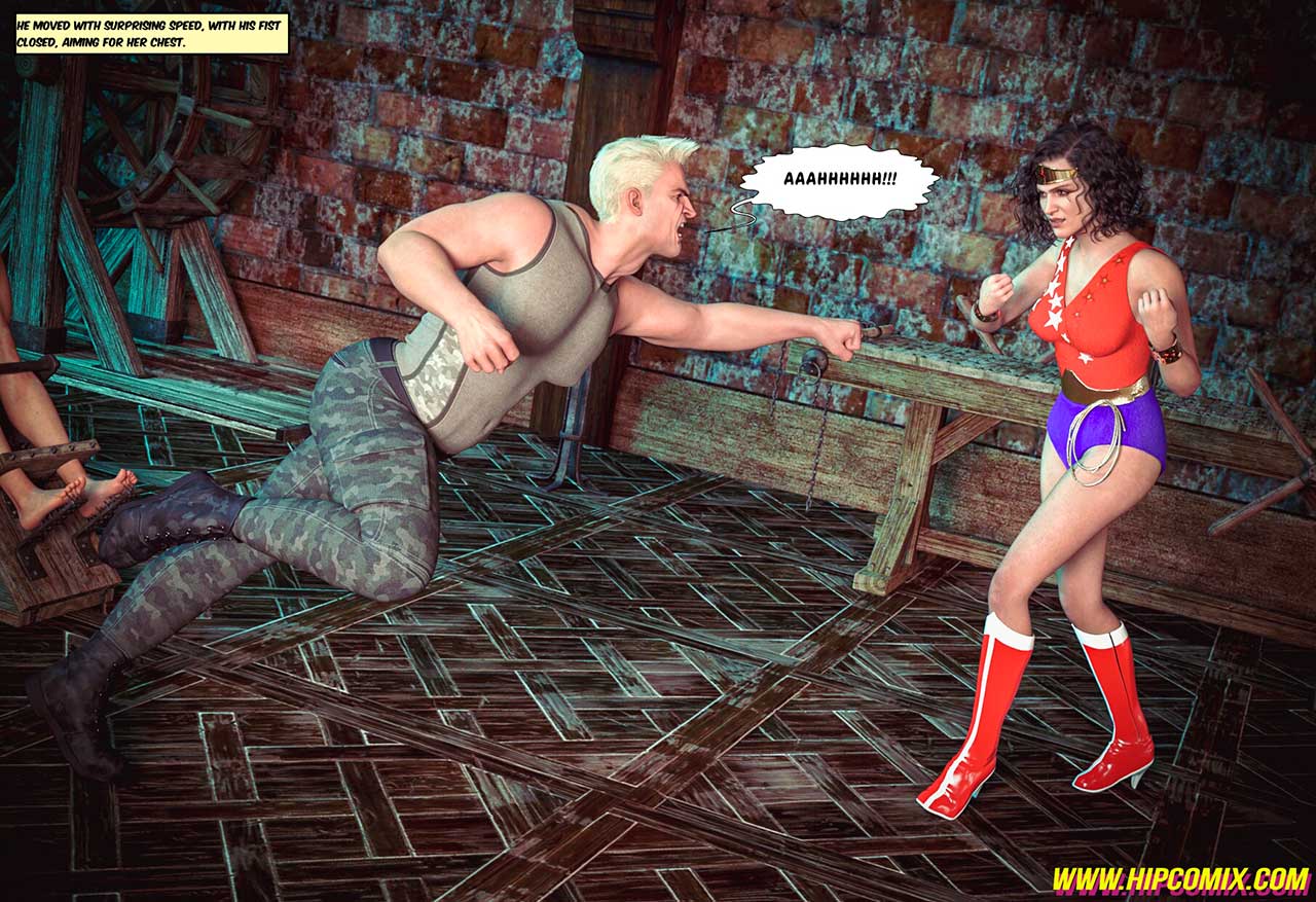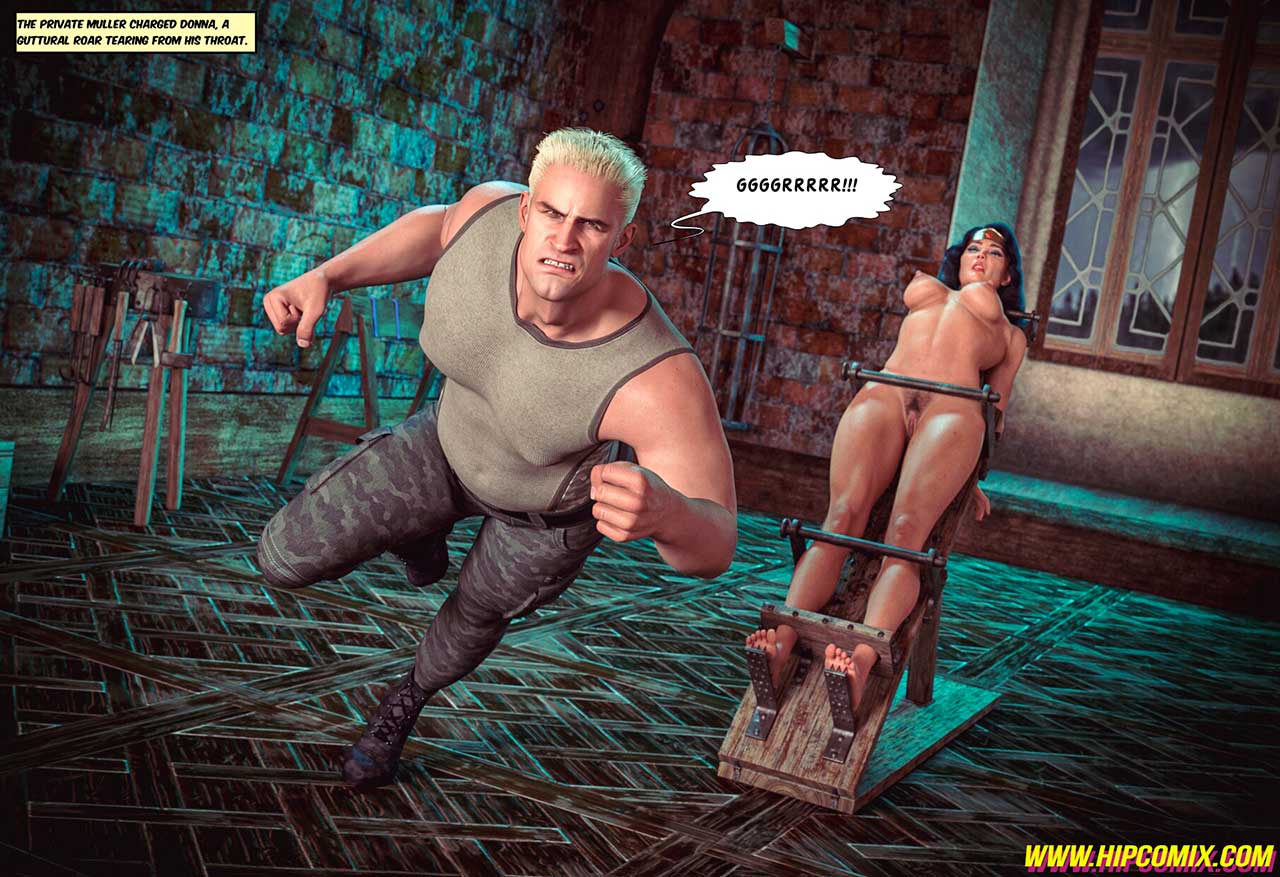 Castle Schatt's Dungeon... A place of unspeakable horrors. The villainous Colonel Schatt subjected Wonder Woman to cruel and inhumane treatment using an abhorrent torture device inspired by the brutal methods of the ancient Inquisition, all in his relentless pursuit of information regarding the whereabouts of the legendary and mythical Paradise Island. Following his unsuccessful attempt, he is now preparing to employ a different method in order to obtain the valuable information from the courageous Amazon princess who remains his captive... However, as a result of the drug she has been administered, Diana is on the verge of disclosing the secret location of Paradise Island. Just as she is about to reveal this critical information, an unforeseen individual suddenly makes an entrance, interrupting the moment!CLICK HERE to read BLUNDER WOMAN - SCHATTEMANN 2: