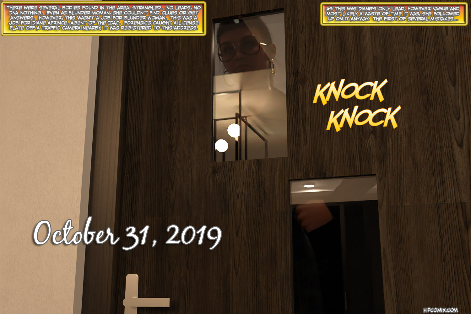 Diane Aprince. Agent for the IDAC (and secretly Blunder Woman) is investigating a series of murders in a rural area outside of Washington D.C. A killer dubbed “the strangler“ has been wreaking havoc on a small Virginia town, and Diane finally has her first lead. A license plate registration leads her to an isolated house deep in the woods. Has she found the killer or has she walked straight into a trap? Will Diane find the killer in time to stop another brutal massacre, or will she add her name to the list of victims? The answer to these and many new questions begin to unfold in this newest Halloween edition for Hipcomix! Part one of the 2019 Blunder Woman Halloween special posts today!