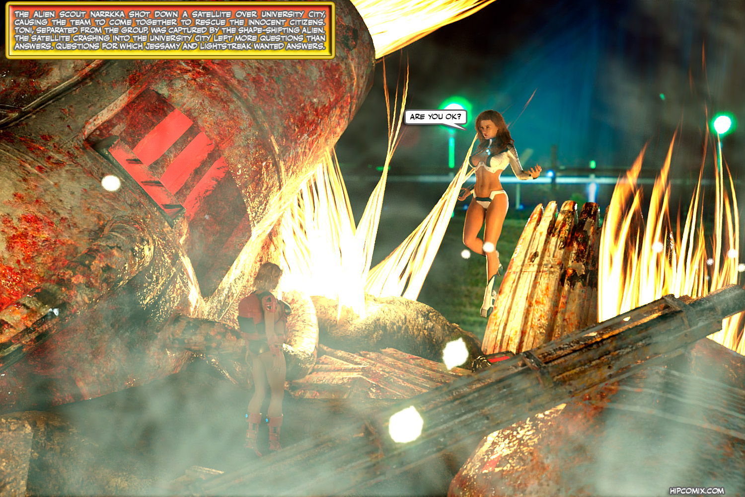 In our last episode, The alien Narrkka captured Greer and used her to find out information about Lightstreak and Atomae. In her curiosity, Narrkka shot down a satellite over University City to watch how the heroines responded. Using her shapeshifting capability, She captured and swapped places with Toni, a Sorority member!