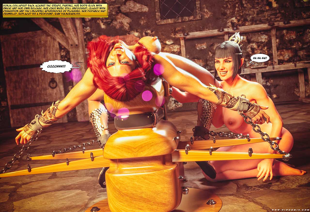 For his reincarnation to be fulfilled, the malevolent sorcerer Anaal Nathrakh requires Red Sonja's total submission to complete the ritual. Evylaad, his loyal servant, tirelessly inflicted painful torment upon the courageous warrior, but the Hyrkanian woman remains unyielding. Nearby, the half-resurrected wizard heads for his foreboding stronghold's underground dungeons in company of her new apprentice, determined to break Red Sonja's will... Now with after Sonja's merciless spanking, Anaal Nathrakh leaves the prisoner in the hands of the new Darken Maelia to break Sonja's will at all...
