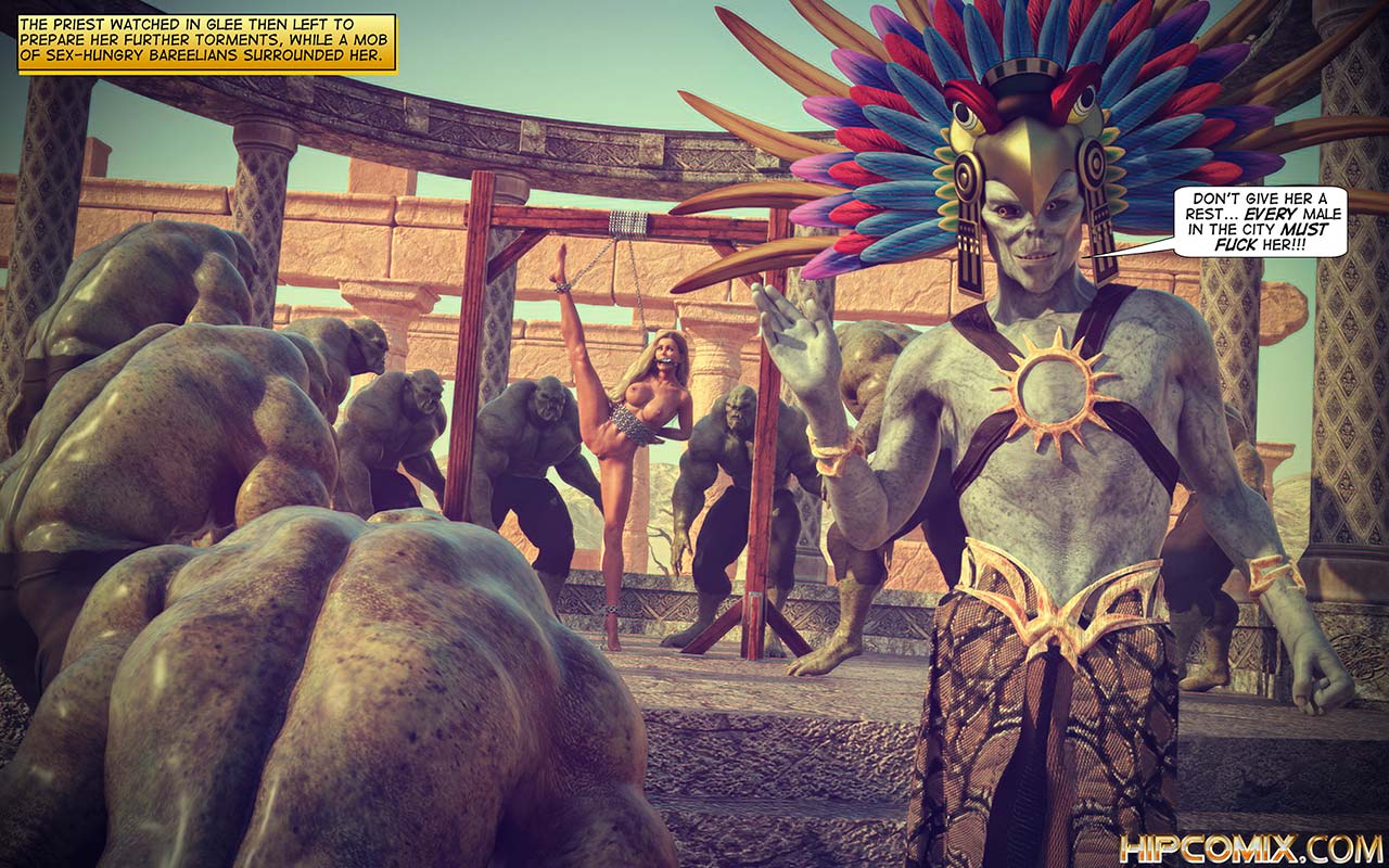 Astrid glared defiantly at the salivating city crowd, but twisted nervously. The elder priest watched in glee, then he left to prepare her further torments while a mob of sex-hungry Bareelians surrounded her.