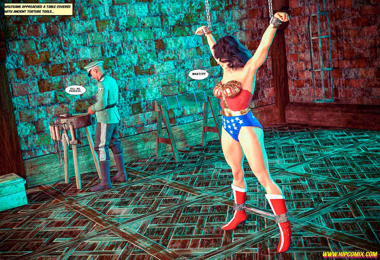 Germany 1941... Castle Schatt, deep in the Schwarzwald. The air here tasted of iron, fear and ancient unholy purpose. Inside the oppressive castle, Blunder Woman woke up in the private chambers of Colonel Wolfgang Schatt, a place built for breaking of bodies, centuries before the nazis laid claim to its stones. The evil nazi officer straightened, gesturing boradly around the dungeon, the light iluminated a host of horrors, Schatt's fingers brushed the cold, rusted iron of a medieval rack, almost affectiontely...